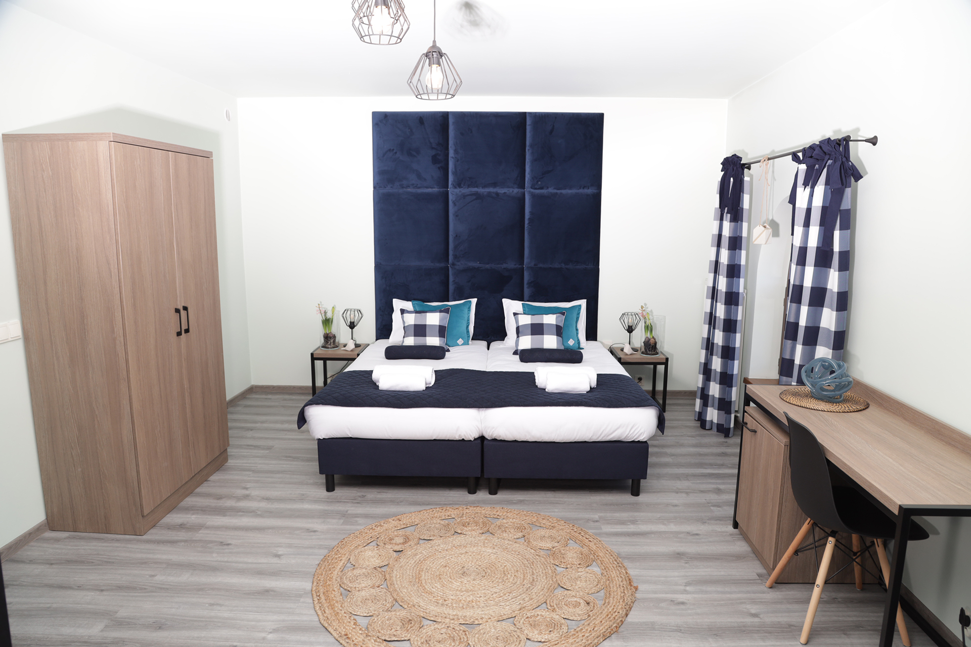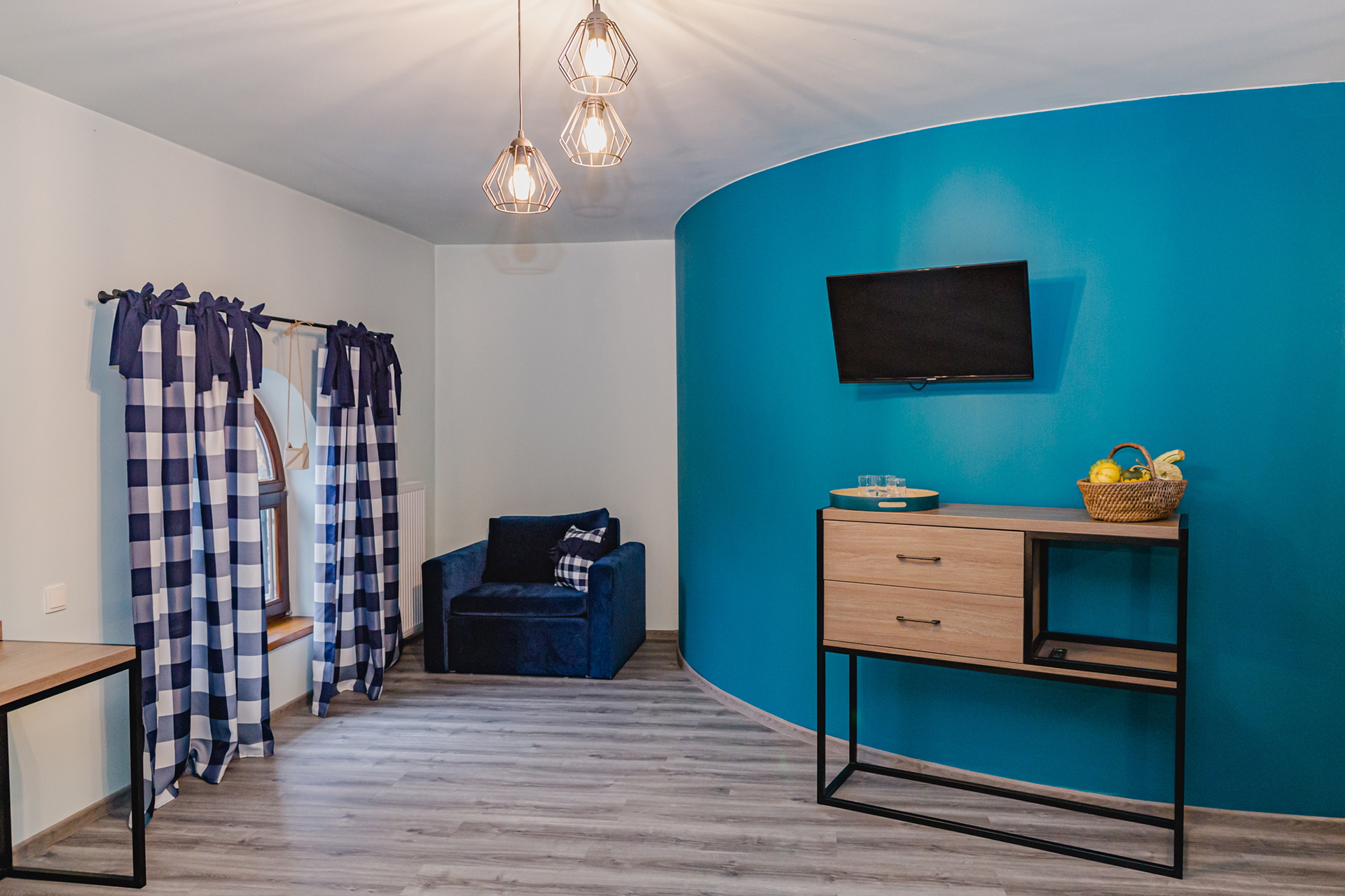Jeśli podczas swoich podróży szukacie niecodziennych aranżacji wnętrz to ten pokój jest dla Was. Bardzo ciekawy, przestronny i komfortowy pokój z dużym łóżkiem małżeńskim z eksponowanym zagłówkiem, z możliwością rozsunięcia i przygotowania dwóch osobnych łóżek. Istnieje możliwość noclegu dodatkowej osoby na rozkładanym, komfortowym fotelu. Pokój bardzo ciekawie zaprojektowany, z półokrągłą ścianą w kolorze intensywnego turkusu. Istnieje możliwość wstawienia łóżeczka turystycznego dla Waszej najmłodszej pociechy. W pokoju czeka na Was zestaw powitalny – woda mineralna, czajnik oraz kawa i herbata.