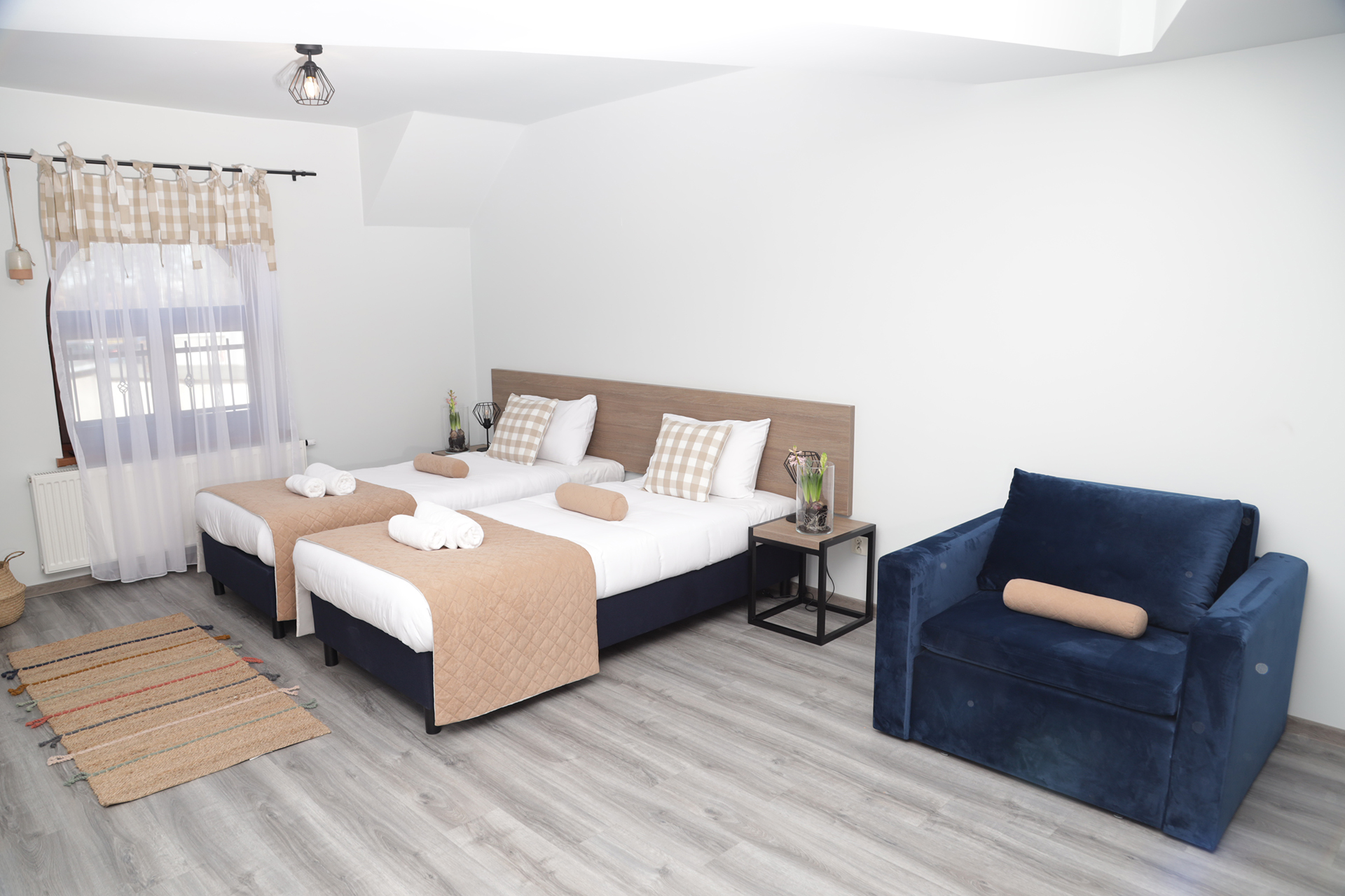Przestronny, jasny pokój z trzema łóżkami pojedynczymi typu Twin o szerokości 90 cm. Dwa z łóżek można złączyć w łóżko małżeńskie. Pokój funkcjonalnie zaprojektowany. Posiada komfortowe biurko do pracy.