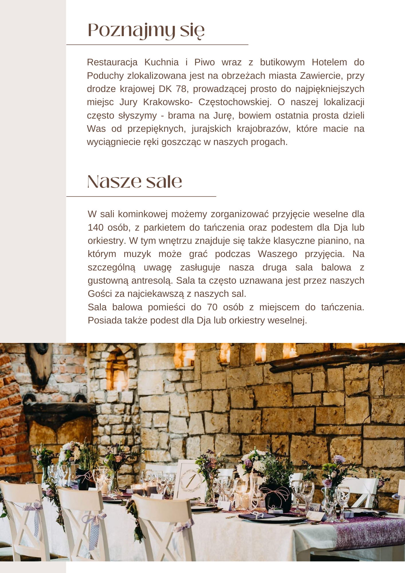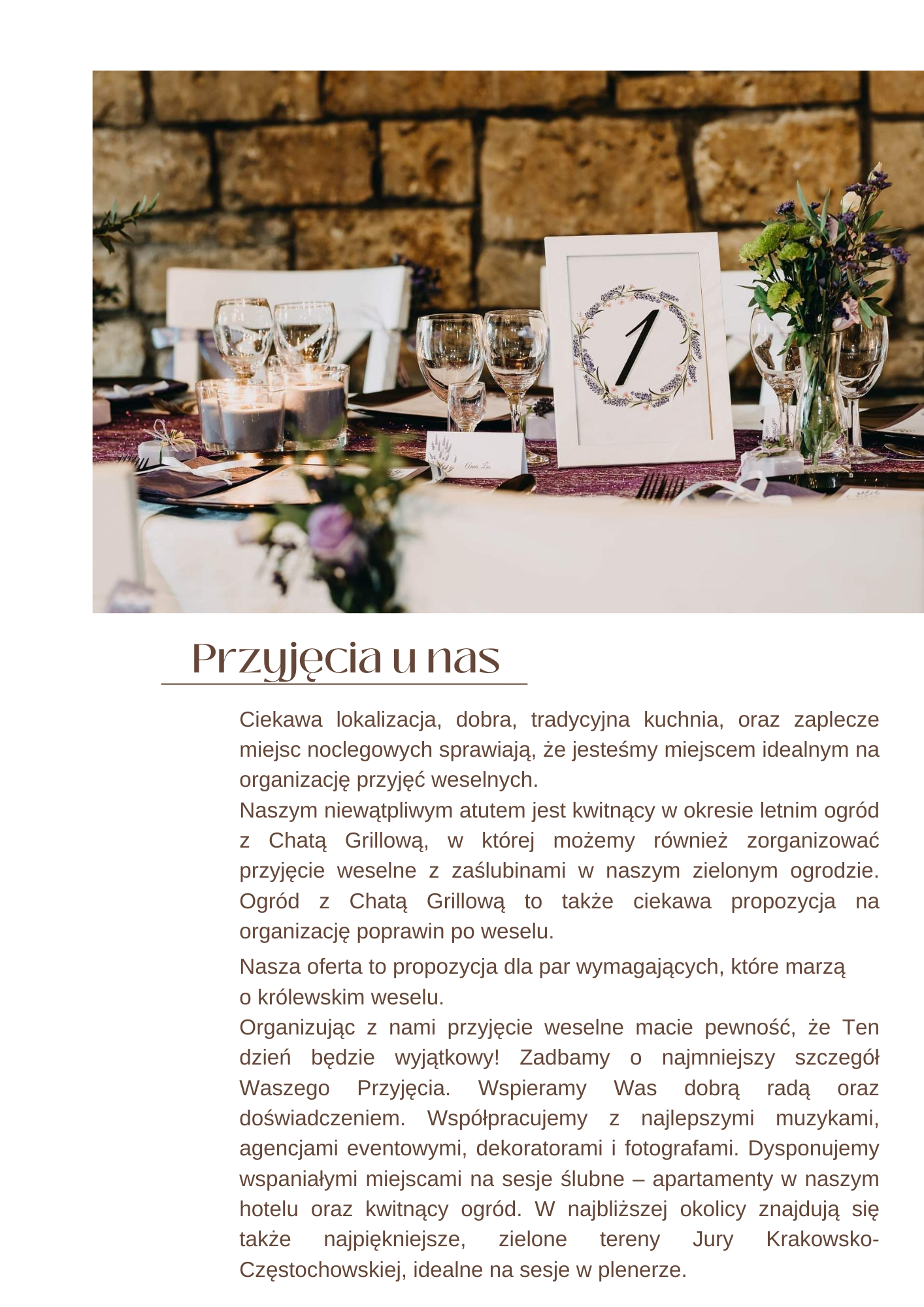 Zapraszamy do organizacji z nami przyjecia weselnego rodem z królewskiego dworu! Nasza lokalizacja, tradycyjna kuchnia, a także bogate zaplecze miejsc noclegowych sprawiają, że jesteśmy miejscem idealnym na organizację przyjęć weselnych. Nasza oferta to propozycja dla par wymagających, które marzą o królewskim weselu. Organizując z nami przyjęcie weselne macie pewność, że Dzień Waszego ślubu będzie wyjątkowy! Zadbamy o każdy detal Waszego Przyjęcia. Od pierwszego kontaktu wspieramy Was dobrą radą oraz doświadczeniem. Współpracujemy z najlepszymi muzykami, agencjami eventowymi, dekoratorami i fotografami. Dysponujemy wspaniałymi miejscami na sesje ślubne – apartamenty z kąpielami piwnymi w naszym hotelu oraz kwitnący ogród. W najbliższej okolicy znajdziecie też najpiękniejsze, zielone tereny Jury Krakowsko-Częstochowskiej, idealne na sesje w plenerze. Niewątpliwym atutem i ciekawym pomysłem na sesje w plenerze, jest majestatyczny Zamek Ogrodzieniec w Podzamczu, zlokalizowany od nas zalewie 7,5 km! ZamekOgrodzieniec ostatnimi czasy dał się poznać jako miejsce zaślubin par w ramach programu "Ślub od pierwszego wejrzenia" produkcji TVN. To miejsce godne polecenia na sesję ślubną!